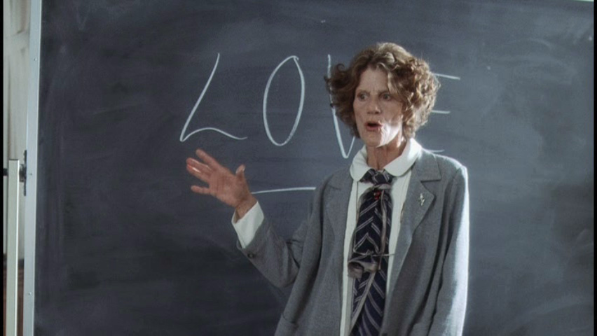 Vaughn writes LOVE on the blackboard, saying this: " Mad, passionate love, that crosses all boundaries... and that's why we still relate to it today... Who among us has not felt passion? And there are some that would say that umm...love is... tired, umm, well... a social construct if you will... What do you girls think? Loren?" |